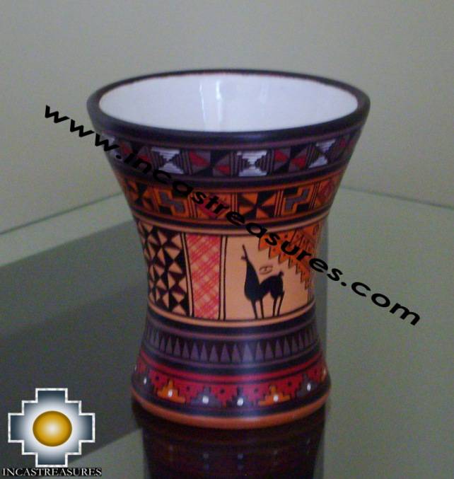 Our Home decor ceramic Kero is unique, elegant, this kero vase celebrates the artistic legacy of the Inca Empire and Culture. Our artisans craft this piece of ceramic and paint by hand distinctive motifs known as tocapu, which celebrates the harvest ceremony with a farmer and his llama at work in the